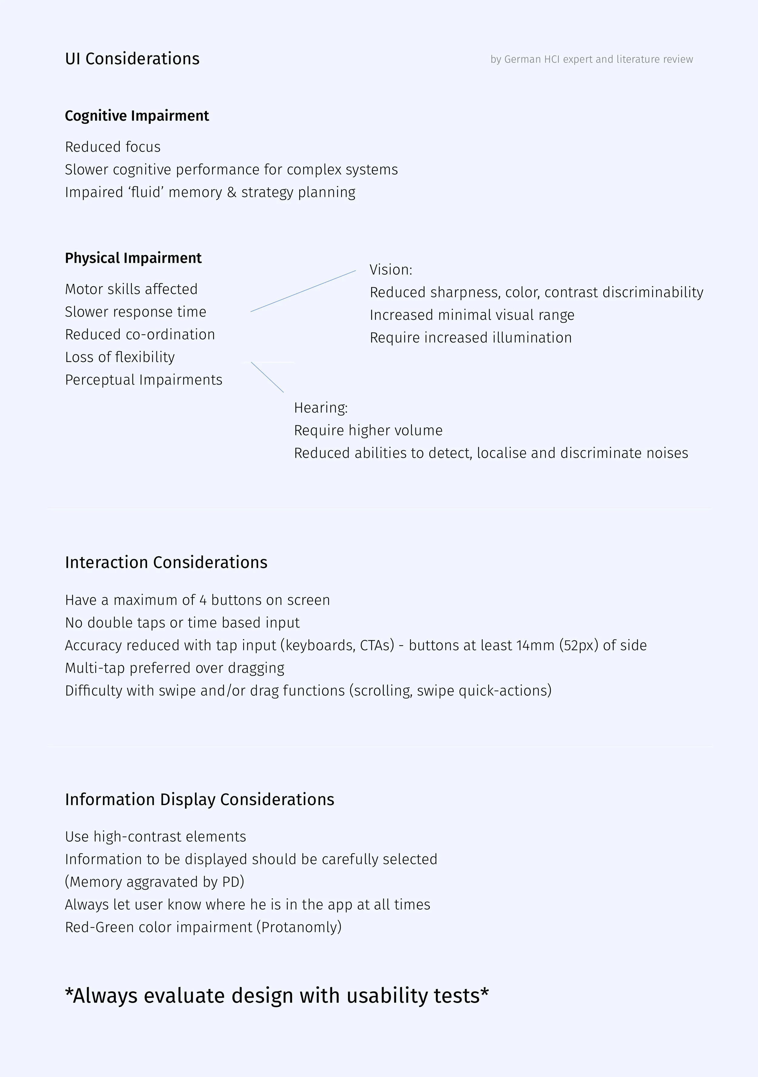 To start the project, I did a literature review of designing for people with motor disability, read medical research papers sent from Germany, and had people speak to German HCI experts to better understand my target audience.
